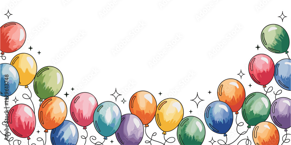 banner. frame hand drawn cartoon watercolor balloons symbols of party. design holiday greeting card and invitation of holidays background #1929613748