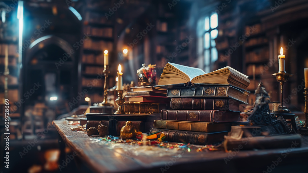 Banner or header image with stack of antique leather books in library. literature or reading concept. Partially Generative AI. #609728669