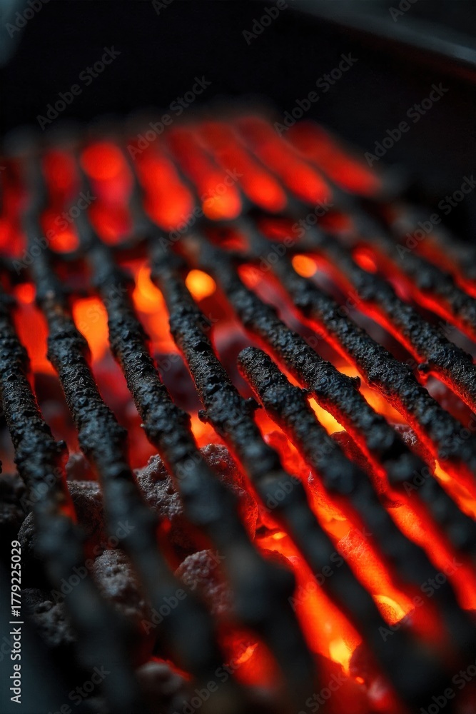 Barbecue Grill with Flare ups and Sizzling Fat Droplets on Hot Grates Close up, dynamic shot of a barbecue grill s hot grates. Small, vibrant orange flare ups are occurring as droplets of fat sizzle #1779225029
