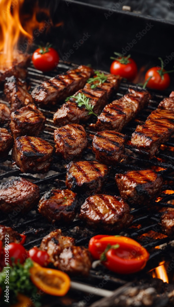 Barbeque grill with delicious grilled meat and vegetables on blurred party people background High quality photo #710649292