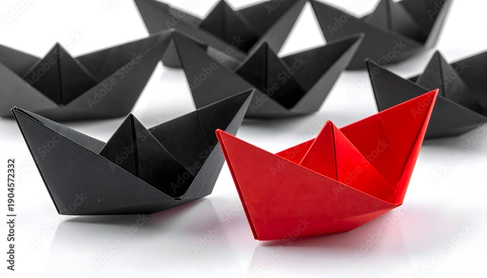 Barco de papel rojo entre barcos negros sobre fondo blanco, concepto de liderazgo y pensamiento diferente #1904572332