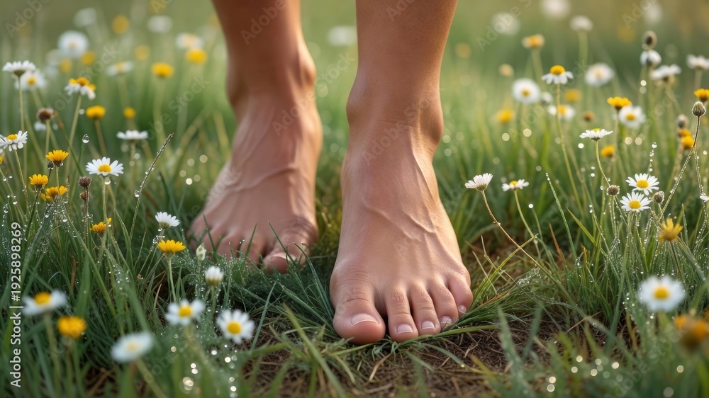 Barefoot person walking on dew covered grass and wildflowers, connecting with nature, enjoying freedom and wellness #1925898269