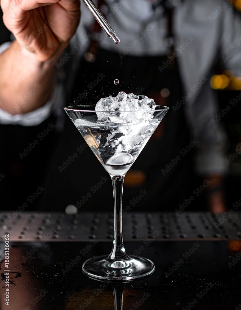 Bartender coloca hielo en una copa de martini durante la preparación de un cóctel clásico. #1885136062