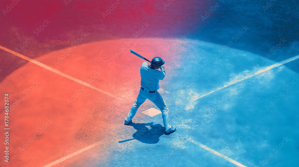 Baseball player stands ready at home plate, bat in hand, with dramatic red and blue lighting highlighting field and converging foul lines, creating intense, focused atmosphere #1784682074