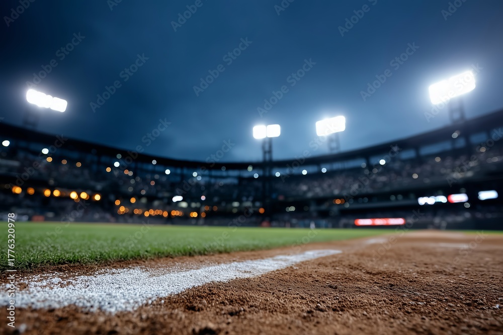 Baseball stadium under dark evening sky with bright floodlights illuminating the field, low angle view from the baseline showing contrast between green grass and red clay #1776320978