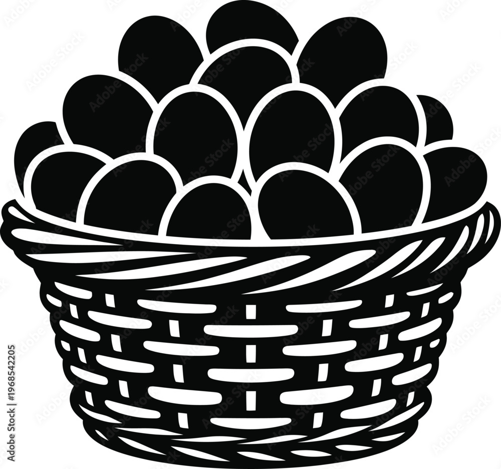 Basket of fresh farm eggs vector illustration, black silhouette with many eggs inside. #1968542205