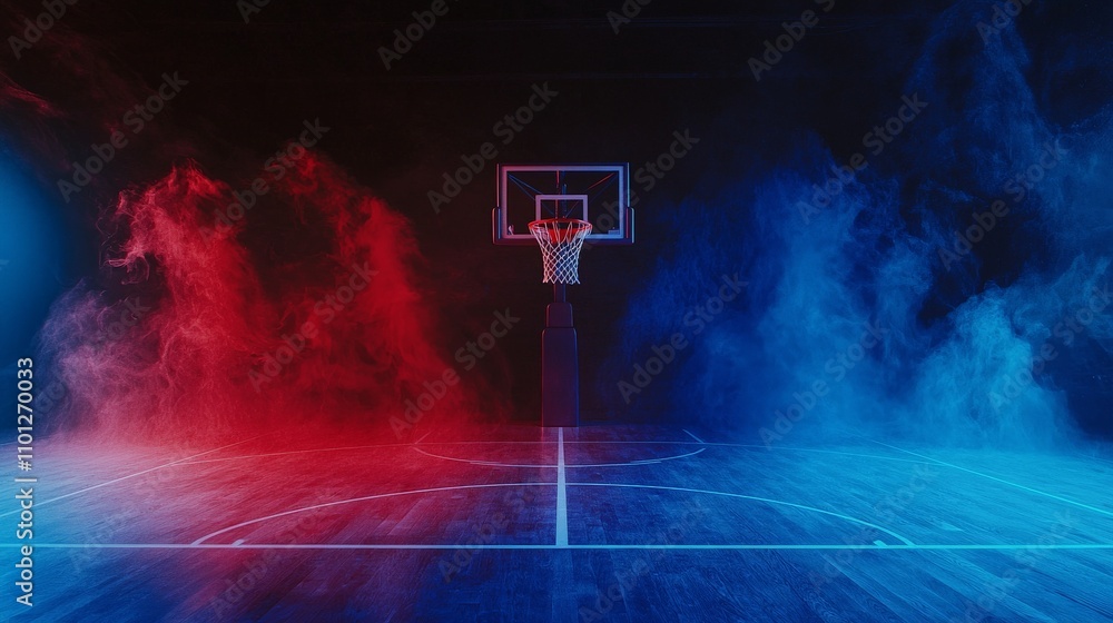 Basketball court and hoop background, front view, match atmosphere, red and blue color dust, dynamics. #1101270033