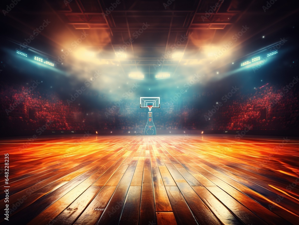 Basketball sport arena. Interior view to wooden floor of basketball court. basketball hoops side view. sport background , Generative Ai #648228235