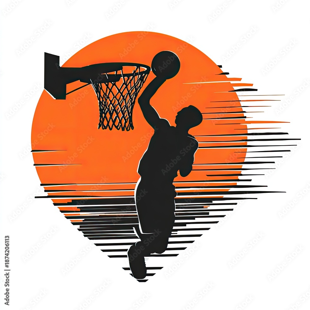 Basketball Sport Logo Orange hoop with net black silhouette dunking motion streaks urban court vibe isolated on white background #1874206113