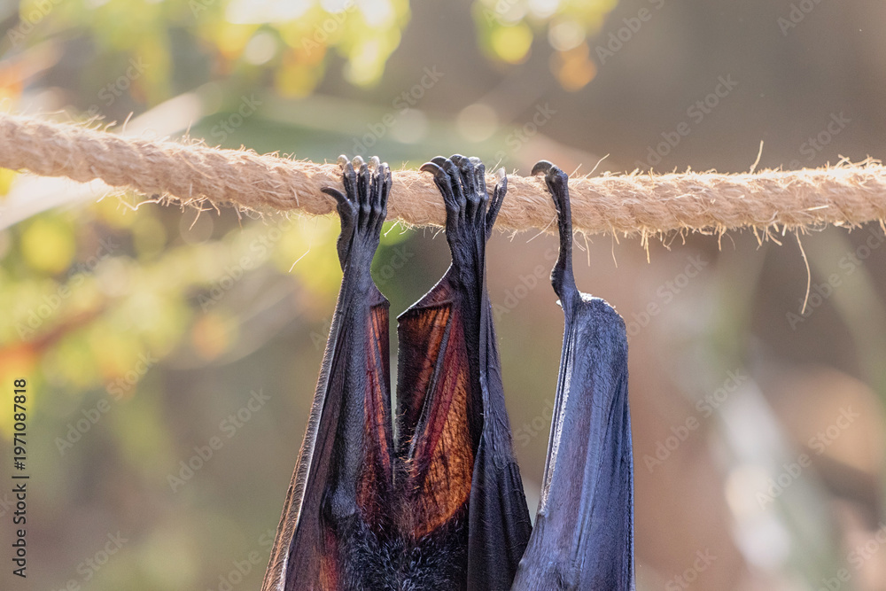 Bat clinging to a thick rope with its powerful claws. Furry wings are folded, resting in an upside down position #1971087818