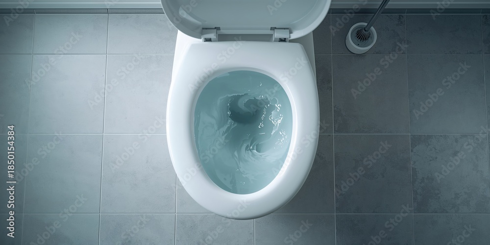 Bathroom fixture showing water flow into the toilet bowl, highlighting plumbing operation #1850154384