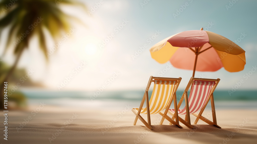 Beach chairs and umbrella on sand defocused palm trees, faceless tropical paradise, vacation visualization detail, blurred sunset background, beach concept, tourism interface, leis #1785947461