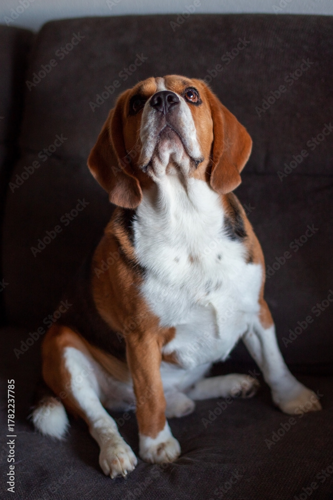 Beagle Dog Looking Upwards on a Dark Couch #1782237785