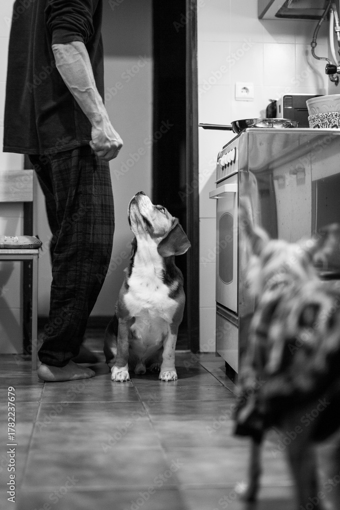 Beagle dog sitting on the kitchen floor. Black and white. Two dogs eagerly watch their owner for a treat indoors #1782237679
