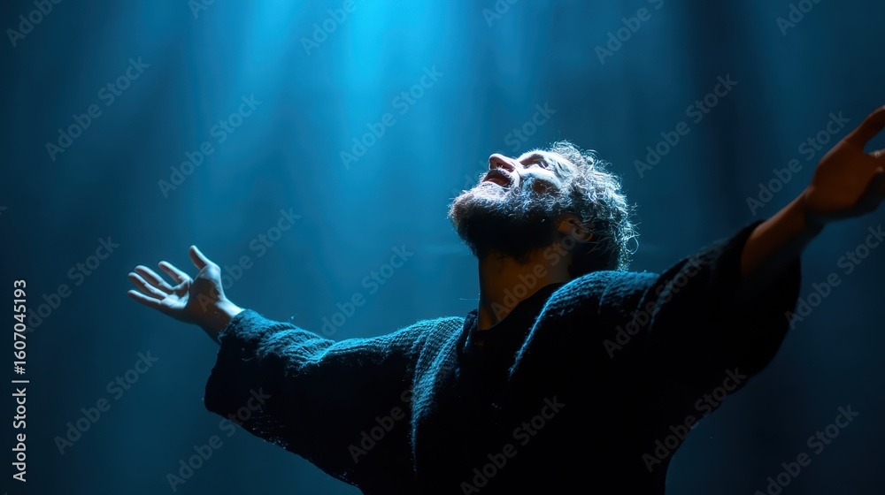 Bearded actor in dark costume, raising arms dramatically while gazing upward to blue stage lighting, embodying intense theatrical performance #1607045193
