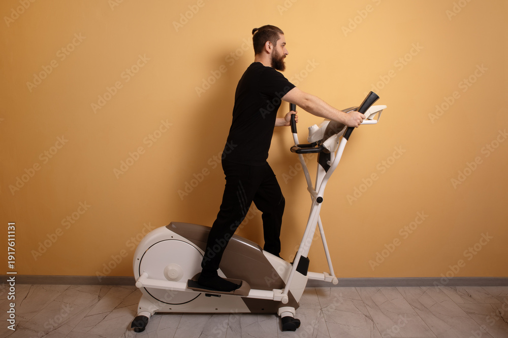 Bearded man in black sportswear using an elliptical trainer against a plain orange background, focusing on fitness and healthy lifestyle. #1917611131