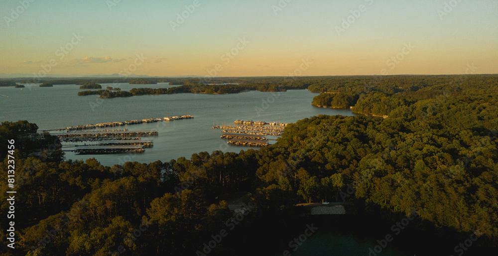 Beautiful aerial view of Marina at Lake Lanier shot during golden hour in Buford, GA, USA #813237456