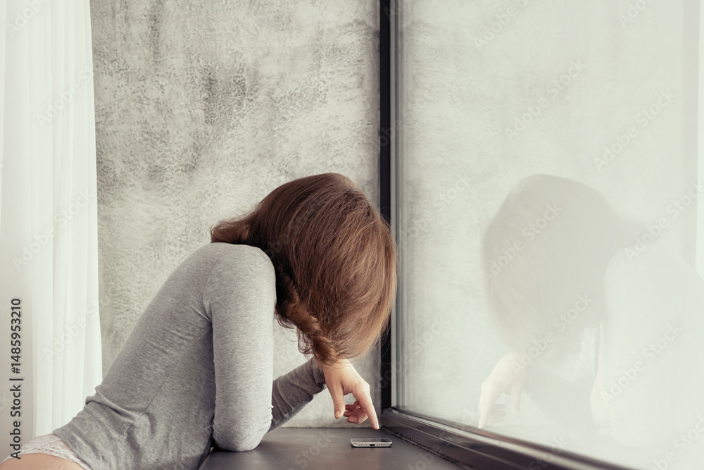 Beautiful сaucasian young woman standing near big panoramic window and looking at mobile phone. #1485953210