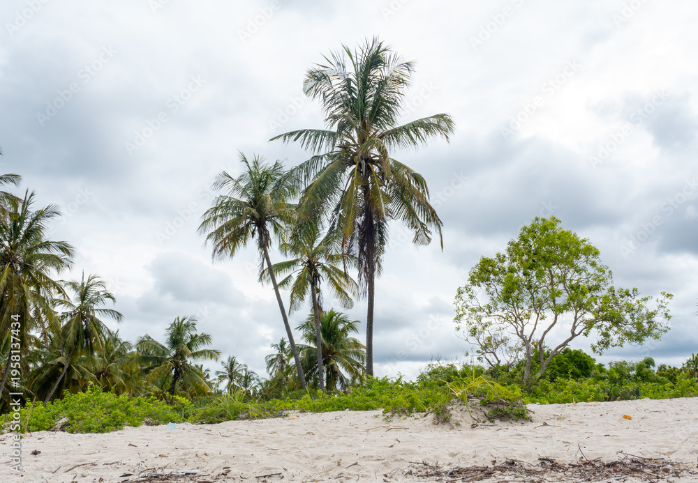 Beautiful beach sunset with golden sky reflecting over calm ocean waves, creating a peaceful tropical landscape. #1958137434