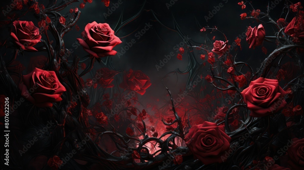 Beautiful bloody red roses with black foliage and sharp thorns on black background. #807622206