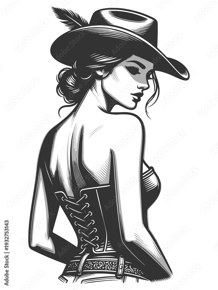 beautiful cowgirl looking over shoulder in wide brim hat, western fashion vibe sketch engraving generative ai fictional character raster illustration. Scratch board imitation. Black and white image. #1932753143