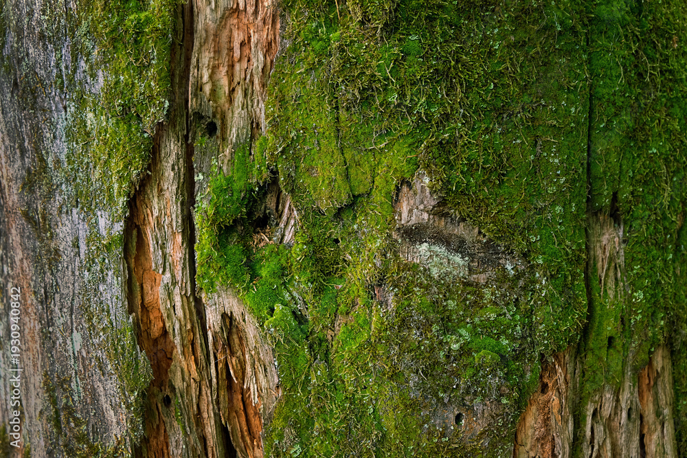 Beautiful green moss and lichen texture close up on tree bark, abstract nature background. Nature mossy surface of tree, macro shot. purity freshness nature. full frame. template for design #1930940842
