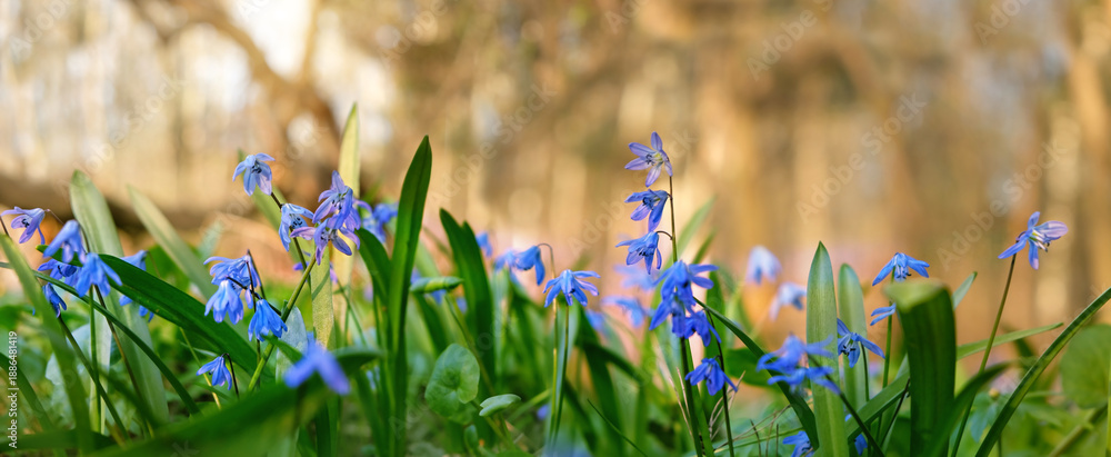 Beautiful nature background with blue snowdrop flowers growht in forest. first early spring perennial primroses, blue flowers of Scilla siberica close up. gentle spring floral landscape. banner #1886481419