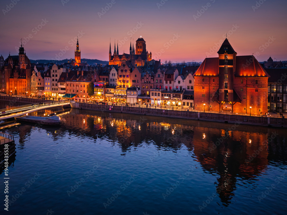 Beautiful old town of Gdansk with historic architecture over the Motlawa river at dusk, Poland #1948435538