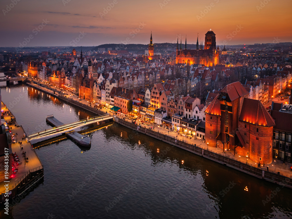Beautiful old town of Gdansk with historic architecture over the Motlawa river at dusk, Poland #1948435617