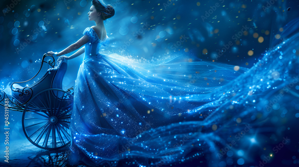 Beautiful princess in blue long dress on the luminous blue carriage background. ai generative #945119381