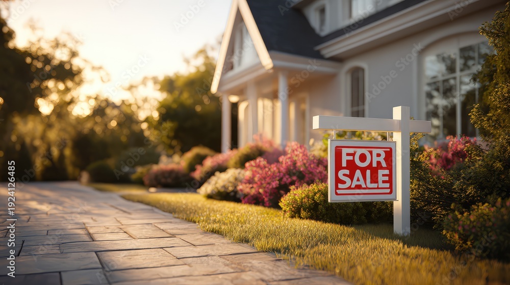 Beautiful suburban house with colorful flower garden and 'For Sale' sign, showcasing the charm of real estate in a peaceful neighborhood during golden hour. #1924126485