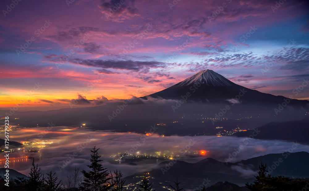 Beautiful sunrise and foggy view of Fuji Mountain with mist in Autumn, Kawaguchiko Lake, Japan. Mount Fuji is the highest mountain in Japan #1756779238