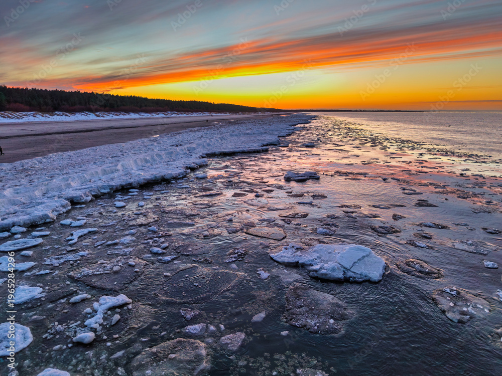 Beautiful sunset over the frozen Baltic Sea beach in Jantar, Poland #1965284296