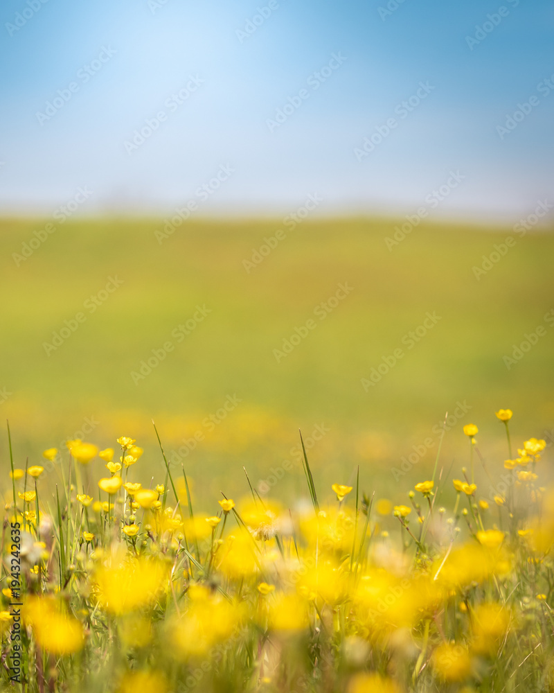Beautiful view of a countryside with flower meadows and blue sky in background. Spring in the country with nature all around. Outdoors, relax, summer, natural concept. Crocodile view of yellow flowers #1943242635