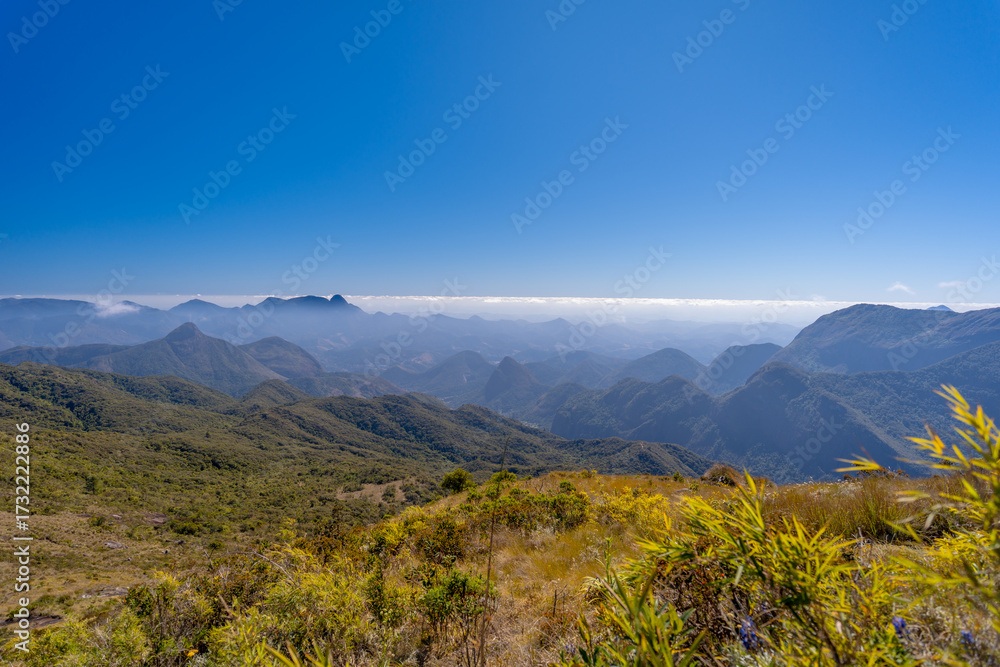 Beautiful view of the Brazilian mountains during the adventure and trail crossing and hike between Petrópolis and Teresópolis in the Serra dos Órgãos National Park (PARNASO). #1732222886