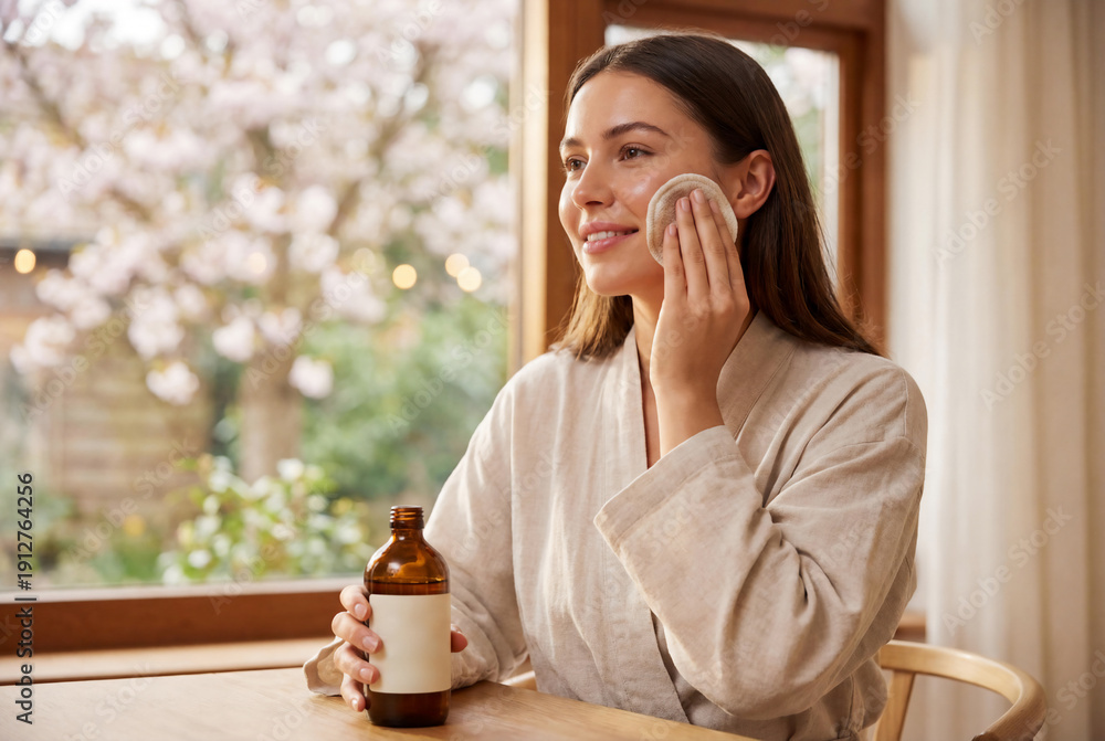 Beautiful woman applying natural face toner with reusable cotton pad during morning skin care routine in front of window with spring blossom tree background #1912764256