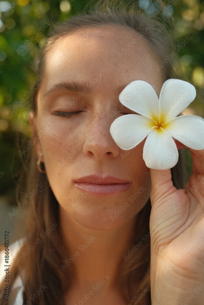 Beautiful woman with closed eyes holding white plumeria flower over her eye, natural skin and tropical sunlight. #1860415792