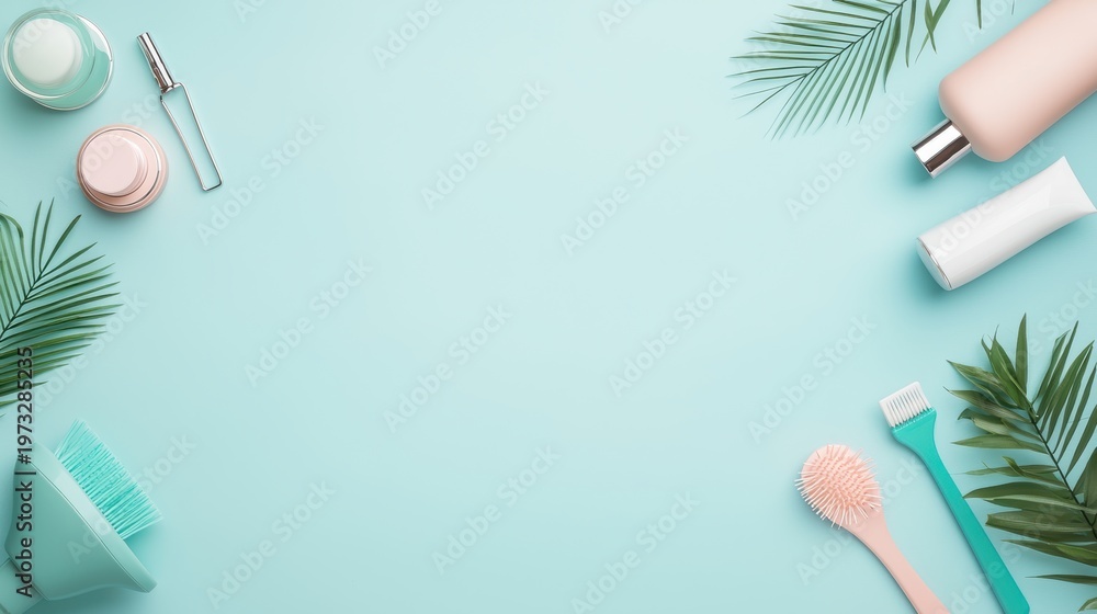 Beauty salon workspace with neatly arranged hair products, tools, and styling essentials. #1973285235