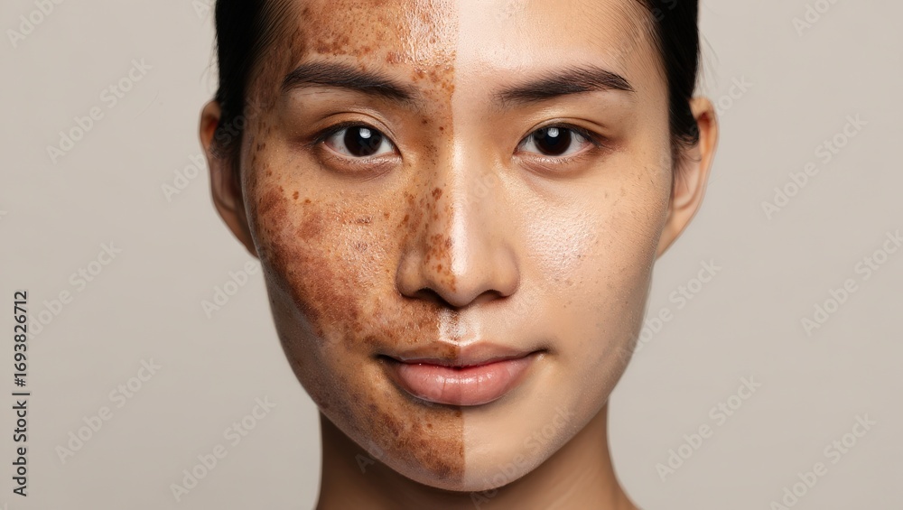 Before and after comparison of melasma on female face, visible pigmentation spots contrasted with even skin tone after active treatment and brightening care, Selective Focus #1693826712