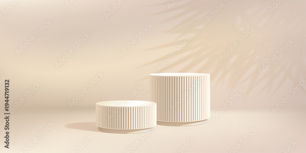 Beige bg product podium, soft plant shadow overlay. Marble 3d platform in creamy studio, palm tree gobo. White fluted elegant pillar, cylinder platform. Skincare natural cosmetic pedestal two level #1944719132