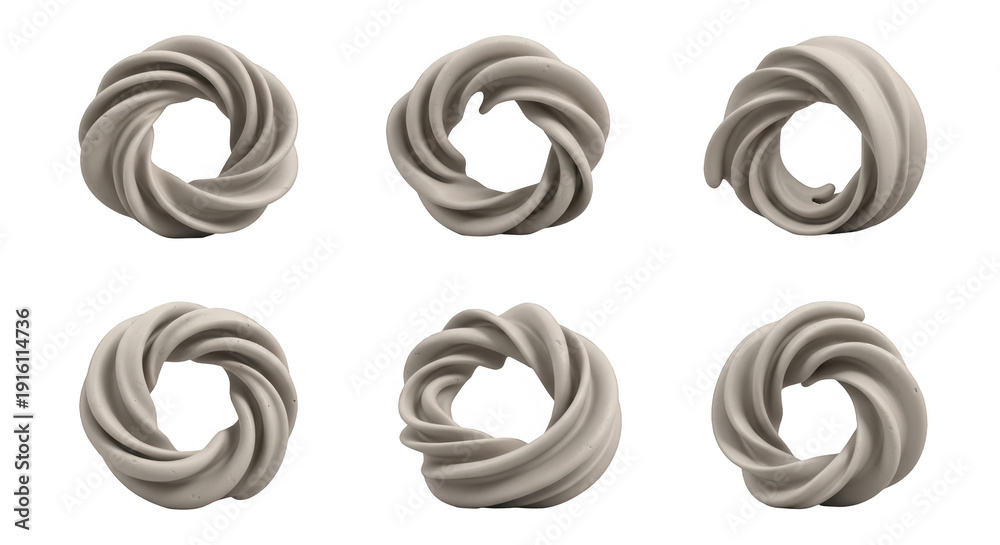 beige 3d modeled donut like structures arranged on a white backdrop varied perspectives for use in design decoration and animation #1916114736