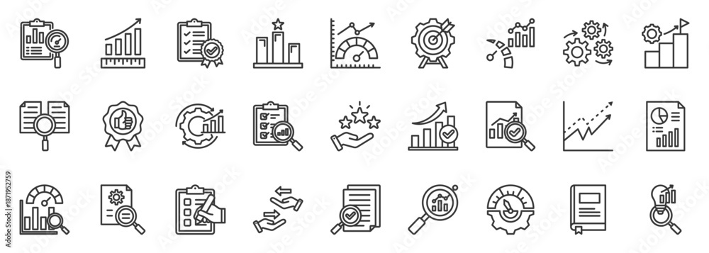 benchmarking icon set collection in outline style. icon pack contain compare, metrics, analyze, rank, standard, target, measure, insight, performance, evaluate icon #1871952759