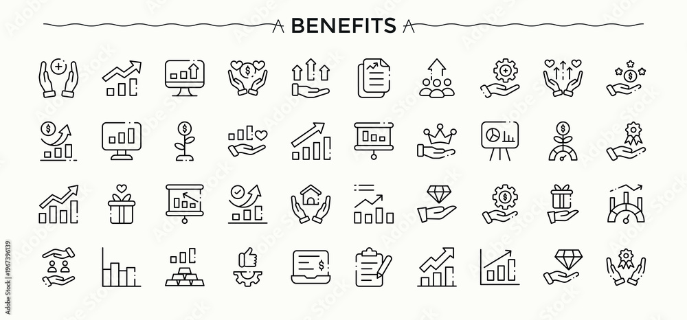 Benefits icon collection. Thin outline icons pack. Pictogram and infographic. Employee Benefit simple icon set. Pack of pay, employee benefit, gift, reward, benefit and more. #1967396139
