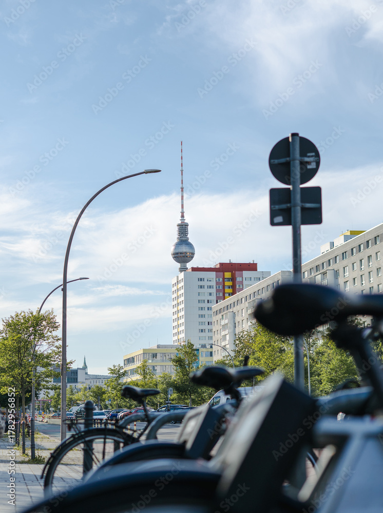 Berlin's street view with city bikes parking, residential buildings along the road and famous TV tower #1782956852