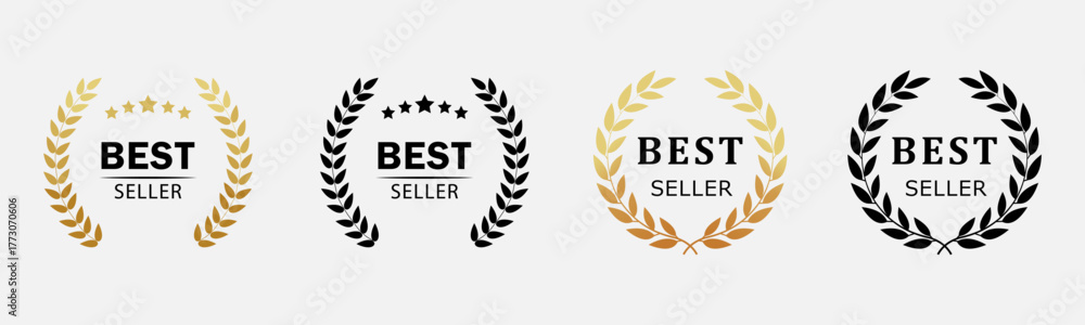 Best seller award badges in gold, black showcasing top-rated achievements in publications. Set best choice. Vector #1773070606