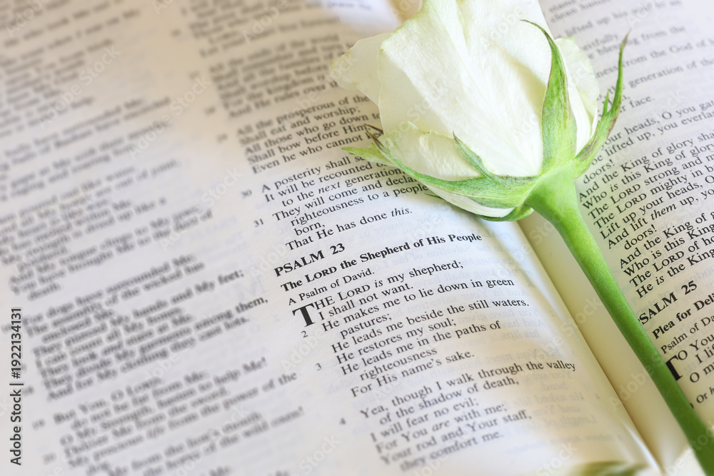 Bible open to Palams 23 with a white rose on the page. #1922134131