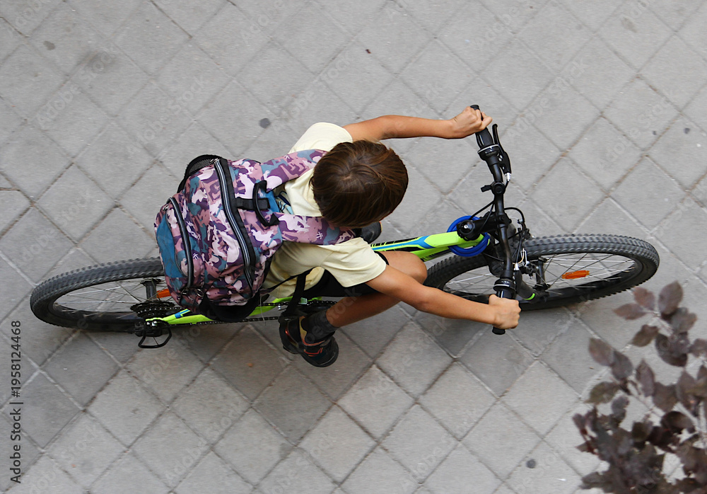 Bicicleta y niño ciclista escolar pedaleando con mochila de colegio en perspectiva aérea desde arriba #1958124468