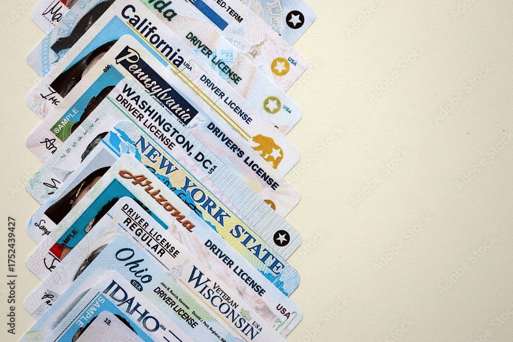 Big amount of driving licenses from different USA states. Stack of driving license specimen cards #1752439427