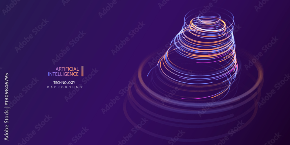 Big data concept with neon circular lines in blue and orange color. Ai abstract round particles technology banner. Artificial Intelligence futuristic connecting tunnel circles vector design. #1909846795