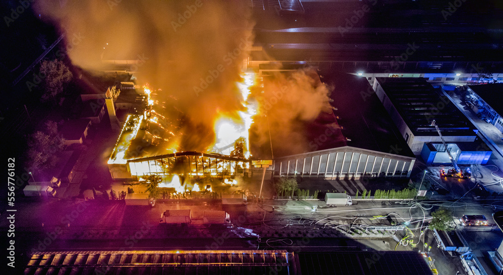 Big fire of an industrial company in the night taken by a drone. Firefighters in action to extinguish a large fire within an industrial area #556776182